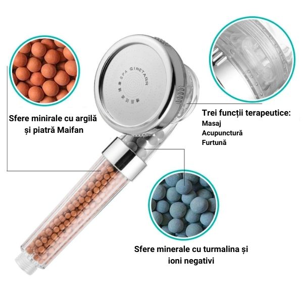 Capul de dus cu pietre minerale transforma experienta dusului zilnic intr-o sedinta terapeutica de relaxare si revigorare pentru corp si minte.